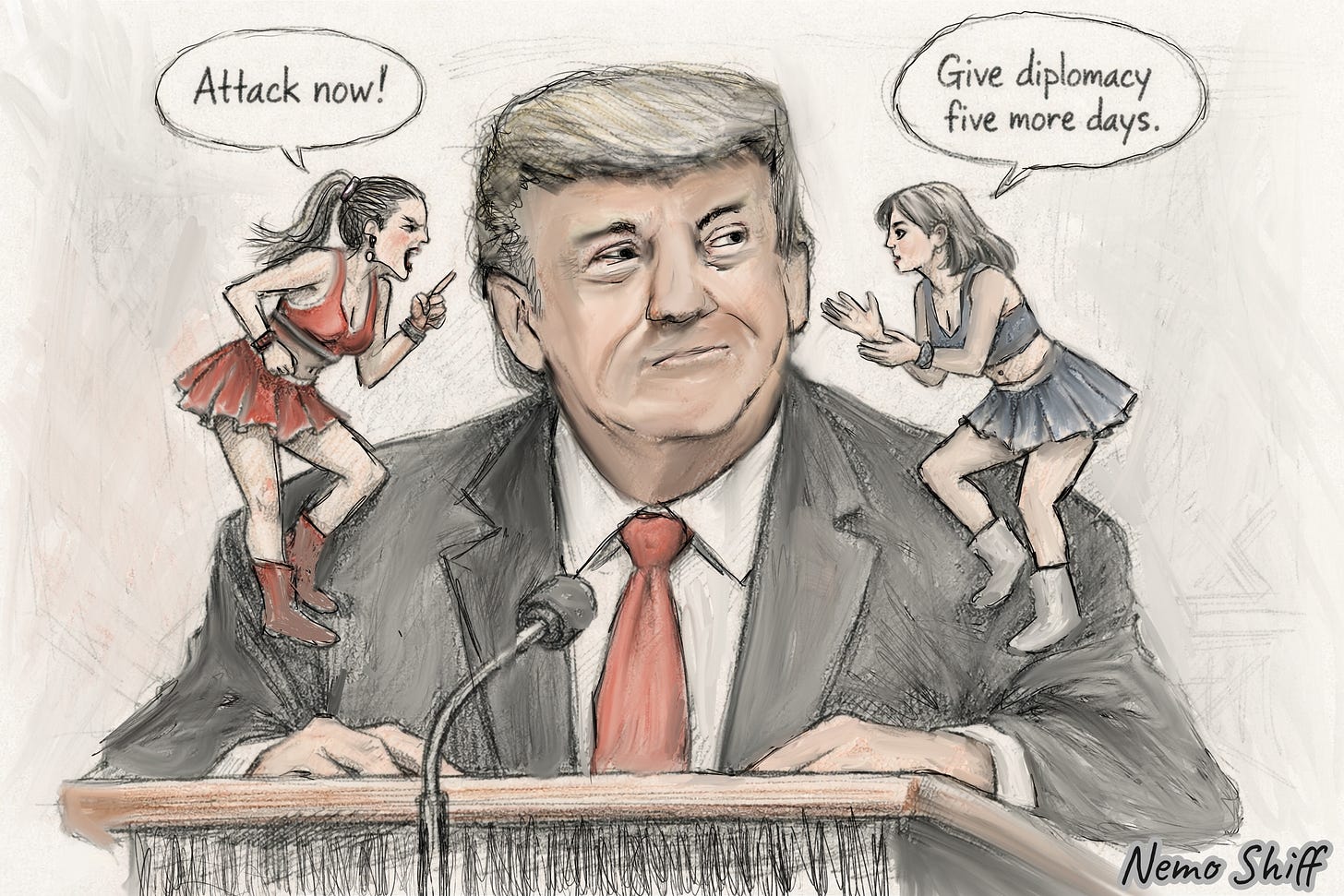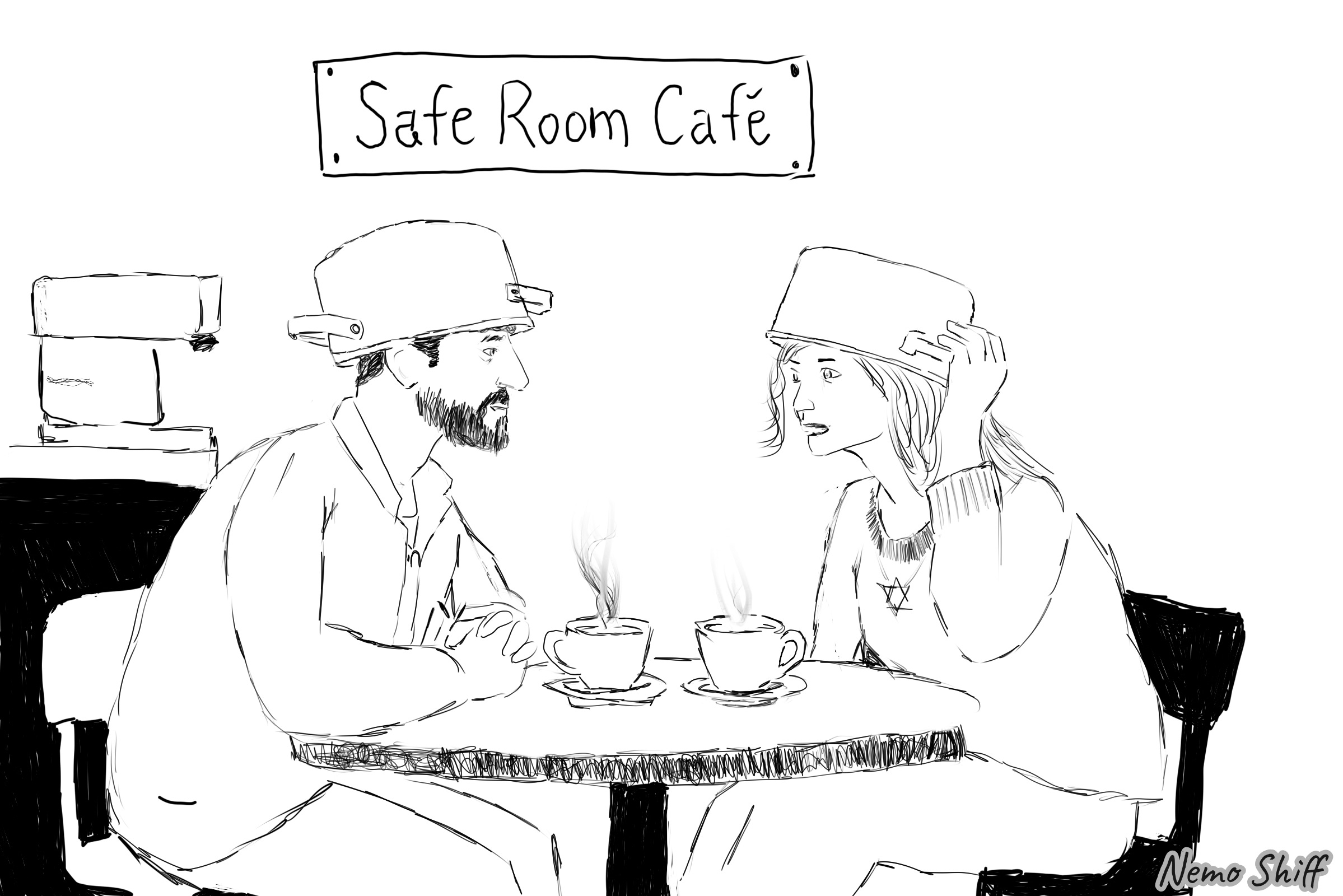 Somewhere between the absurd and the real, between reaction and observation. Nowadays, I can draw an imaginary scene, and other times I respond to something that actually happened.